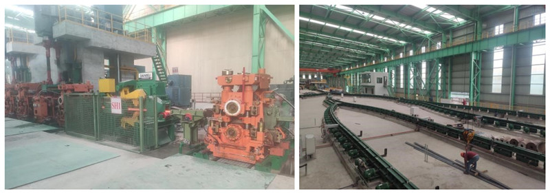 龍騰特鋼高速端板法蘭生產(chǎn)線是國內(nèi)采用全連軋工藝生產(chǎn)的高速端板法蘭軋鋼生產(chǎn)線,產(chǎn)品涵蓋國內(nèi)外端板法蘭的絕大部分規(guī)格要求。通過雙蓄熱步進式加熱爐加熱后,鋼坯進入11臺平立交替布置的高剛度短應力線軋機,實現(xiàn)全連續(xù)無扭軋制。通過我院專利設(shè)備浮動式夾送輥和平立轉(zhuǎn)換裝置,不同規(guī)格的端板法蘭扁鋼可在軋制完成后實現(xiàn)快速平轉(zhuǎn)立,并通過轉(zhuǎn)轍器及卷前輥道分別輸送至6臺卷取機進行卷取。生產(chǎn)線配備先進的自動控制系統(tǒng),對全線物流進行跟蹤,實現(xiàn)工藝過程的自動化。先進的設(shè)備與合理的工藝流程,大大提高了生產(chǎn)線的生產(chǎn)效率和成材率,預計年產(chǎn)量可達50萬噸。