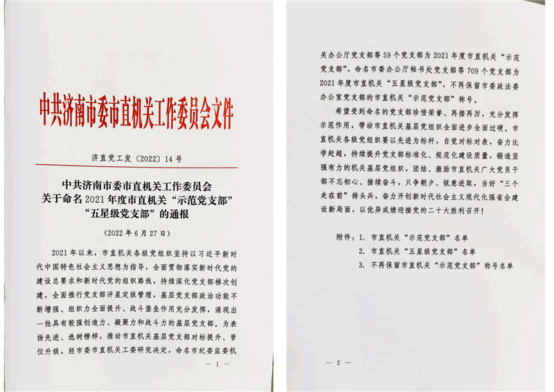 市委市直機關工委印發的《關于命名2021年度市直機關“示范黨支部”、“五星級黨支部”的通報》(濟直黨工發〔20221號文)中,授予我單位熱風爐工程技術分公司黨支部、焦化事業部黨支部、耀華能源公司黨支部、土建設計一部黨支部、土建設計二部黨支部、職能管理第一黨支部、公司辦公室黨支部、電氣設計部黨支部、經營管理黨支部、職能管理第二黨支部共10個黨支部為“五星級黨支部”。獲獎支部將繼續發揮示范作用,團結激勵支部黨員,不忘初心、勇于擔當,努力為公司發展做出更大貢獻。