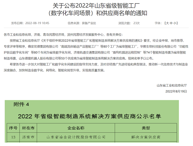 日前,山東省工業(yè)和信息化廳公布了2022年山東省級(jí)智能工廠(數(shù)字化車間場(chǎng)景)和供應(yīng)商名單,我公司入選智能制造系統(tǒng)解決方案供應(yīng)商。